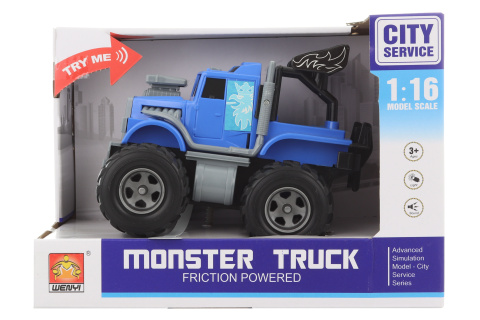Plastový Monster Truck na baterie. Auto po stisknutí tlačítek na střeše svítí a vydává zvuky. Napájení na 3 AG13 baterie (jsou součástí balení). Rozměry auta cca 16 x 12 cm. Rozměry balení cca 24 x 17,5 x 13 cm. Věk 3+