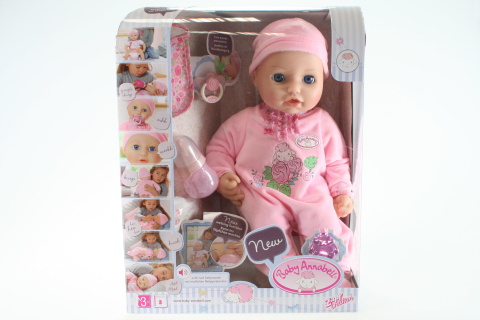 Baby Annabell se chová jako skutečné miminko! Je malinká a potřebuje spoustu spánku. Když Baby Annabell pohoupete v náručí nebo v kolébce, začne zívat, brzy usne a začně spokojeně pochrupávat. Když se vzbudí, je čas na něco k jídlu. Když jí dáte lahvičku začně pohybovat ústy a očima a sát lahvičku jako opravdové dítě.. Když Baby Annabell pohladíte po tváři začne vesela žvatlat. Pláče opravdové slzy, ale pokud jí dáte dudlík, brzy přestane. A také umí další věc – čurá do plýnky, která je také součástíá balení. Součástí balení je lahvička na vodu, dudlík, plenka, bryndák a přívěšek Baby Annabell Velikost panenky: 43 cm. Baterie: 3 x AA (nejsou součástí balení). Věk 3+.
