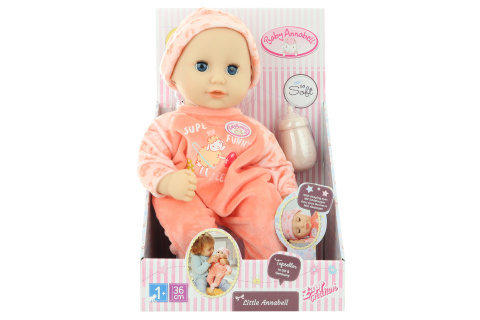 „Dobré ráno! Dneska nás čeká báječný den!“ Little Annabell s měkkým látkovým tělíčkem je beze sporu ranní ptáče. Hned jakmile vysvitne sluníčko, už je připravena si hrát. Samozřejmě se ale nejdřív potřebuje nasnídat. Poté, co se napije z lahvičky, si ráda hraje a mazlí se. Když už je malá holčička unavená, lehne si na záda, aby si odpočinula. Hned se jí zavřou modrá očička. A když se jí ještě spinkat nechce, pozorně sleduje všechno dění kolem, klidně až do setmění. Večerní červánková obloha má stejnou barvu jako dupačky Little Annabell. Tak krásné dupačky v pastelově meruňkové barvě s ladící čepičkou ani není třeba převlékat za pyžamko. Dupačky jsou ušity v tzv. „easy fit“ stylu, díky kterému mohou být velmi snadno převlékány i těmi nejmenšími ručičkami. Baby Annabell Little Annabell je panenka ve velikosti 36 cm s mrkacíma očima. Oblečena je do dupaček a čepičky. Součástí je lahvička. Věk 1+