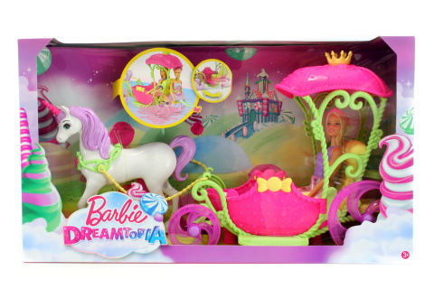 Tento kočár Barbie™ Dreamtopia Sladké království a jednorožec zajistí princeznovské panence Barbie sladkou jízdu. Vyklop dveře, nech ji nastoupit dovnitř a v královském stylu se vydej na cestu! Otevřený kočár je přenádherný a připomíná jahodu, zelené proplétané stěny jsou vzdušné, fialová kola se při jízdě otáčí. Jednoduše panenku Barbie posaď do kočáru a zatáhni nebo zatlač. Tím celý příběh začne. Princeznovská panenka Barbie® může ke společné jízdě pozvat i kamarádku. Bílý jednorožec s růžovým rohem a fialovou hřívou a ocasem je připraven na dobrodružnou cestu kamkoliv, kam ho tvá představivost zavede. Obsahuje panenku Barbie oblečenou v módních šatičkách, doplňky, kočár s pohyblivými koly, jednorožce a uzdu s otěžemi. Věk 3+