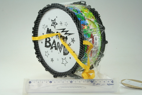 Plastový bubínek v síťce o rozměrech cca 20,5 cm x 9,5 cm. 2 plastové paličky. Věk 3+