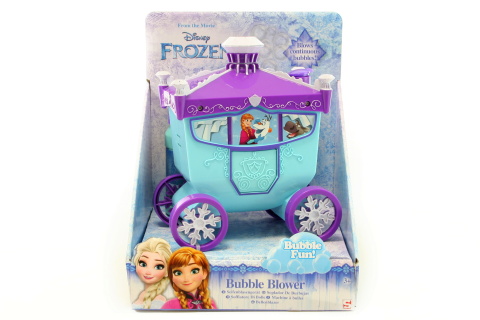 Bublifuk kočár Frozen. Po zapnutí kočár fouká bubliny. Součástí je také roztok bublifuku. Rozměry kočáru cca 15 x 19 x 10 cm. Rozměry balení cca 19 x 17 x 23 cm. Materiál plast. Napájení na baterie 2x AA (nejsou součástí). Věk 3+