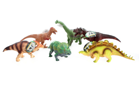 Gumoví dinosauři o délce cca 26 cm (dle druhu). Baleno v papírové krabici (rozměry balení cca 40 x 27 x 14 cm). Věk 3+
