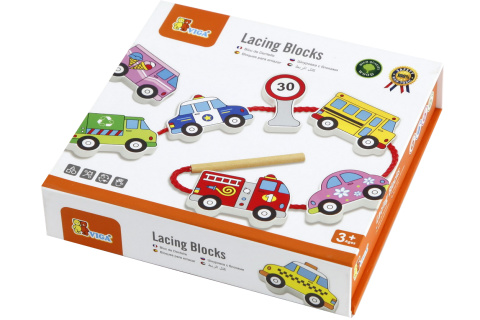 Dřevěné navlékání dopravních prostředků. Obsahuje 12 dřevěných bloků a 1 navlékací provázek. Baleno v krabičce, která slouží jako úschovný box. Rozměry balení cca 21 x 19 x 4,5 cm. Věk 24m+
