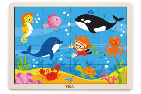 Dřevěné puzzle s obrázkem mořského světa. Celkem 16 dílků. Rozměry obrázku cca 27,5 x 20 cm. Rozměry balení cca 30 x 27 x 1 cm. Věk 24m+
