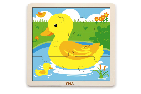 Dřevěné puzzle s obrázkem kachničky. Celkem 9 velkých dílků. Rozměry balení cca 22 x 22 x 1 cm. Věk 24m+