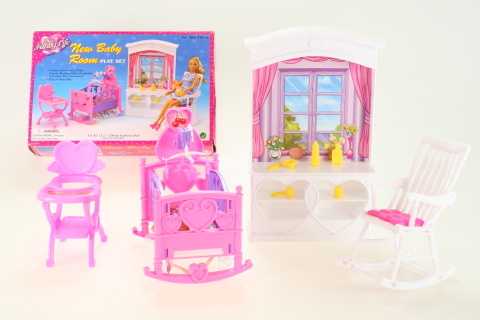 Glorie Dětský pokojíček obsahuje kolébku o rozměrech cca 12,5 cm X 14 cm X 16 cm s kolotočem,peřinkou a polštářkem miminkem o velikosti cca 6 cm,židličku cca 7,5 cm X 9 cm X 12 cm, houpací křeslo cca 7,5 cm X 11 cm X 14 cm,skříňku s dekorem okna o rozměrech cca 16 cm X 5 cm X 25 cm s doplňky pro miminko.Vyrobeno z plastu.Panenka není součástí balení.Věk 3+