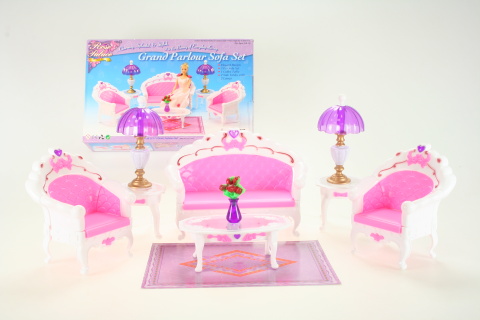 Sedací souprava Glorie obsahuje pohovku (23 x 16 x 12 cm), dvě křesla(15,5 x 11 cm), dvě lampy (výška 14,5 cm), dva odkládací stolky (výška 8 cm), koberec, konferenční stoleček (15,5 x 9 cm) a vázičku s květinou. Panenka není součástí balení. Materiál: plast, Věk 3+.