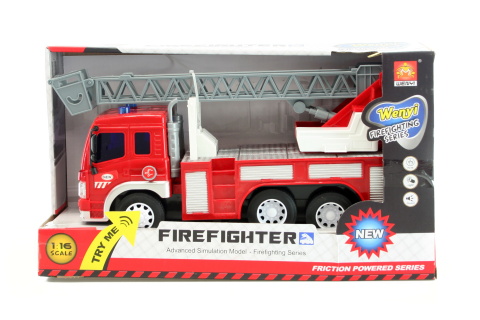 Hasičské auto na baterie. po stisknutí tlačítka vydává zvuky a svítí. Rozměry auta cca 27 x 10 x 15 cm. Napájení 3x baterie AG13 (je součástí). Rozměry balení cca 33 x 12 x 18 cm. Věk 3+