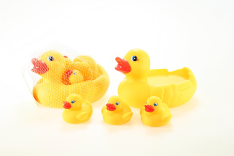 Hračka do vody – kačenky. Obsahuje jednu velkou a tři malé kačenky. Rozměr velké kačenky cca 17 x 10 cm.