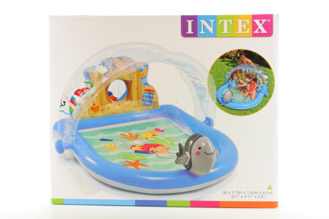 INTEX nafukovací hrací centrum s vodotryskem a stříškou o rozměrech 1,70 m X 1,50 m X 81 cm. Věk 3+. Součástí hracího centra je průhledná stříška a okraj bazénku zdobí nafukovací rybka. K bazénku patří i 6 plastových míčků, ventil na regulaci průtoku vody a vypouštěcí ventil. Součástí sada na opravu.