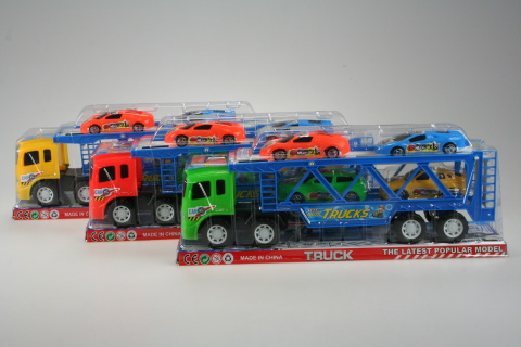 Kamion plastový o velikosti cca 6,5 cm X 35 cm X 10 cm – volný chod – se čtyřmi plastovými autíčky o velikosti cca 9,5 cm.Věk 3+