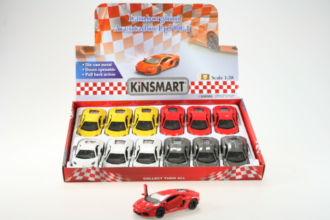 Kinsmart Lamborghini Aventador LP700-4 – Model auta v měřítku 1:38.Kovové auto s otevíracími dveřmi v kombinaci s plastovým spodkem.Na zpětné natažení – pull-back.Velikost modelu cca 13 cm.Věk 3+