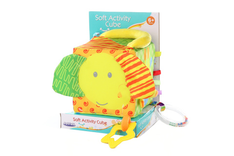 Plyšová kostka s různými aktivitami (kroužky, chrastítko, tkaničky, zvířátka, rolnička, barevné vzory a další). Rozměry kostky cca 12 x 12 cm. Rozměry balení cca 15,5 x 14,5 x 21 cm. Věk 6 měsíců+