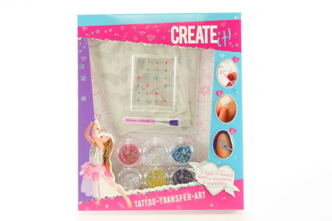 Tetovací sada obsahuje archy s obtisky, barevné ozdobné kamínky, šteteček a 6 druhů třpytek na ozdobu tetování. Rozěmry balení cca 20 x 25 cm. Věk 6+
