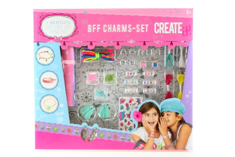 Sada pro výrobu náramků s talismany pro tebe a tvou nejlepší kamarádku. Sada obsahuje korálky, přívěsky, bavlny a plno dalšího pro výrobu náramků. Možnost vyrobit až 3 druhy různých náramků. Rozměry balení cca 37 x 33 cm. Věk 5+