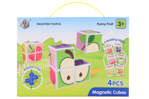 Plastové magnetické kostky s obrázky ovoce. Jedna kostka o velikosti cca 4 x 4 x 4 cm. Balení obsahuje 4 kostky, ze kterých lze sestavit 6 druhů ovoce. Rozměry balení cca 24 x 17 x 5 cm. Věk 3+