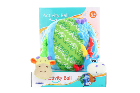 Plyšový míček s různými aktivitami (kroužky, uzlíky, plyšová zvířátka, chrastítka, barevné vzory a další). Rozměry balení cca 22,5 x 18,5 x 29 cm. Rozměr míče cca 20 cm. Věk 6 měsíců+