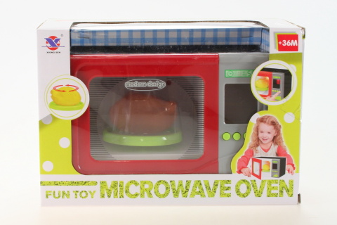 MIkrovlnka na baterie svítí a vydává zvuky. Také se otáčí vnitřní talíř (spolu s plastovým kuřetem). Napájení na 2x AA baterie (nejsou součástí). Rozměry mikrovlnky cca 20 x 12 cm. Věk 3+.