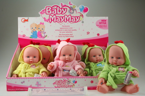 Miminko o velikosti cca 28 cm v župánku ve třech provedeních. Miminko po stisknutí pupíku začne vydávat zvuky. Napájení na knoflíkové baterie – jsou součástí balení. Věk 12 měsíců+