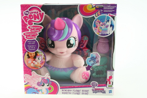 Mluvící miminko Flurry Heart z kouzelného světa My Little Pony. Reaguje na zvuk a dotyk – její roh svítí různými barvami,a mluví česky nebo slovensky více než 15 frází. Tento rozkošný poník má plyšové tělíčko a krásná křídla. V balení s chrastítkem a lahví.Napájení na 3x AAA baterie (jsou součástí). Věk 3+