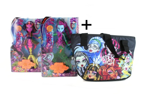 Na dosud poklidném moři roste děsná vlna. Pozor, ať nepohltí všechno, co jí přijde do cesty! Do Monster High připlouvá Posea Reef, dcera Poseidona. Může za to, že stáhne kouzlem monsterky do vody. Pomůže lagooně postavit se svému strachu? Posea Reef má na sobě kouzelný květinový korzet podbarvený korálovou barvou a děsivé doplňky z hlubin moře. Ocas z mořských řas a chapadla, díky kterým může stát a které ve tmě září. Ještě je tu nepochopená a děsně krásná tanečnice Kala Mer´ri, dcera Krakena se zářivými chapadly, hlubinnými šaty a melírovanými vlasy. Mořské doplňky dokreslují její strašidelný vzhled. Prodávají se samostatně. Barvy a dekorace se mohou lišit.Věk 6+. Při koupi 2 panenek obdržíte zdarma 2 ks tašek Monster High.