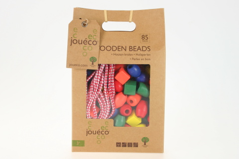 Balení obsahuje 80 dřevěných korálků, 4 provázky na navlékání a jeden pytlíček pro uchovávání korálků. Velikost jednoho korálku cca 2,5 cm. Rozměr balení cca 25 x 13 cm. Věk 3+.