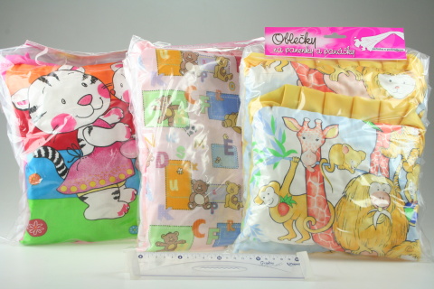 Peřinka s polštářkem pro panenky. Různé barvy a vzory – dodání dle skladových zásob! Polštářek 23x28cm, podložka 50x30cm, peřinka 35x28cm. Věk 3+.