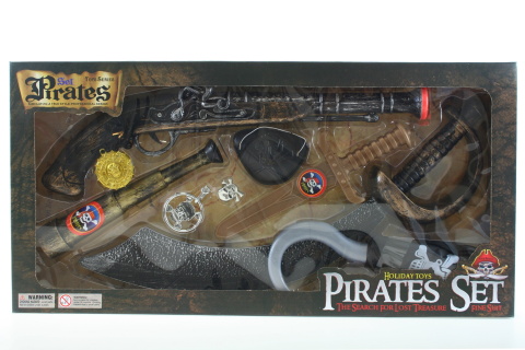 Sada pro piráta obsahuje velkou šavli, bambitku, dalekohled, dýku, hák na ruku, pásku přes oko, prsten s lebkou, náušnici a přívěsek ve zlaté barvě. Materiál plast. Rozměry balení cca 51 x 26 cm. Věk 3+.