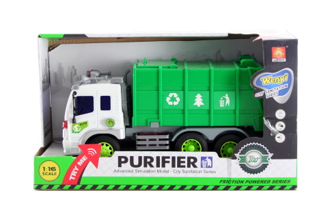Popelářské auto na baterie. Auto vydává zvuky a svítí. Napájení 3x AG13 baterie (je součástí). Rozměry auta cca 28 x 11 x 9 cm. Měřítko 1:16. Rozměry balení cca 32 x 18 x 11 cm. Věk 3+