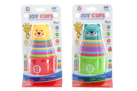 Skládací plastové kalíšky s čísly a písmeny – 9 ks. Rozměr největšího cca 7,5 x 5 cm. Rozměry balení cca 13 x 23 x 7,5 cm. Věk 6 měsíců+