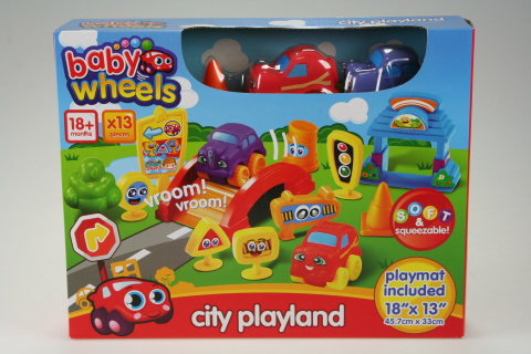 Silnice s auty pro nejmenší obsahuje podložku se silnicí o rozměrech cca 45,7 cm X 33 cm ,na kteru lze libovolně rozmístít plastový nadjezd,stanici,závory ,stromy,značky.Součástí balení 2 gumová autíčka o velikosti cca 6 cm.Rozměr balení cca 29 cm X 22 cm X 22 cm.Věk 18 měs +