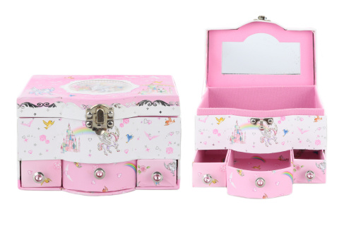 Šperkovnice se šuplíky. Uvnitř víka šperkovnice se nachází zrcátko a ve spodní části šperkovnice se nachází 3 praktické šuplíčky. Rozměr šperkovnice cca 17 x 11,5 x 10 cm. Baleno v sáčku. Věk 3+