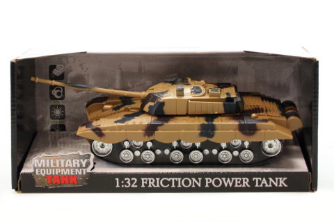 Plastový tank v krabičce. Napájení na 3x baterie AF13 (jsou součástí balení). Tank je na setrvačník a má pohyblivé dělo. Po stisknutí tlačítka vydává zvuky s svítí. Rozměry tanku cca 27 x 10 cm. Rozměry balení cca 29 x 13 x 12,5 cm.