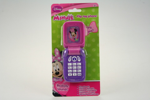 Telefon dětský Minnie o velikosti cca 5 cm X 14 cm – otevřený.Vydává zvuky,pípání,vyzvánění.Provoz na 3 knoflíkové baterie.Věk 3+