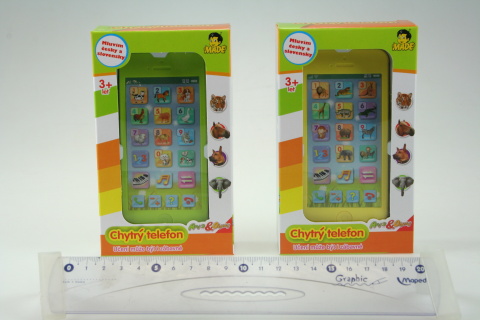 Chytrý telefon učí čísla, poznávat zvířata, hraje melodie, učí počítat a je hožné si zahrát kvíz. Provoz na 3 knoflíkové baterie typu AG13. Věk 3+