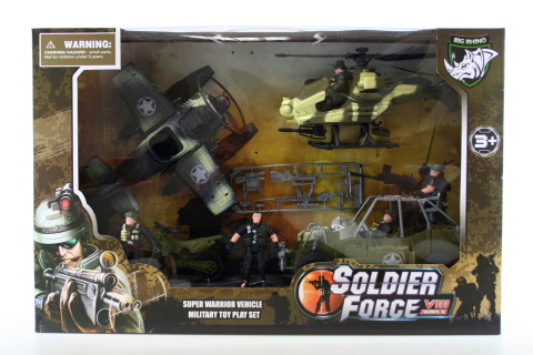 Tato sada obsahuje celou řadu vojáků a dopravních prostředků (letadlo, vrtulník, džíp, motorku, 5 vojáků včetně zbraní a výstroje. Rozměry balení cca 56 x 37 x 12 cm. Rozměr letadla cca 19 x 21 cm, voják cca 9 cm. Věk 3+