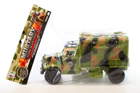 Armádní auto na baterie. Napájení na knoflíkové baterie (jsou součástí balení). Po stisknutí tlačítka po straně začne auto vydávát zvuky a blikat. Rozměr auta cca 33 x 18 x 14 cm. Rozměr balení cca 47 x 32 cm. Věk 3+