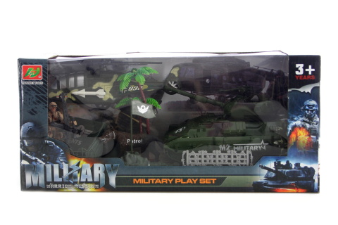 Vojenská sada obsahuje vrtulník, tank, stan, vlajku, vojáka se zbraní, ostnatý plot, psa, ukazatel a palmu. Rozměr tanku cca 19 x 10 cm. Rozměry balení cca 39,5 x 28 x 15 cm. Věk 3+
