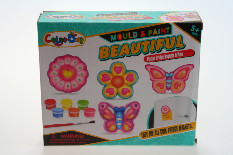 Balení obsahuje 1 sáček sádry,plastovou misku,plastovu formu s 4 druhy s motýlky a květinami,6 barviček na vybarvení,štěteček,6 magnetů – můžete vytvořit magnetku,návod na přípravu,štěteček a plastový nožík na tvoření.Doporučený věk 5+