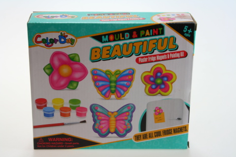 Balení obsahuje 1 sáček sádry,plastovou misku,plastovu formu s 4 druhy s motýlky a květinami,6 barviček na vybarvení,štěteček,6 magnetů – můžete vytvořit magnetku,návod na přípravu,štěteček a plastový nožík na tvoření.Doporučený věk 5+